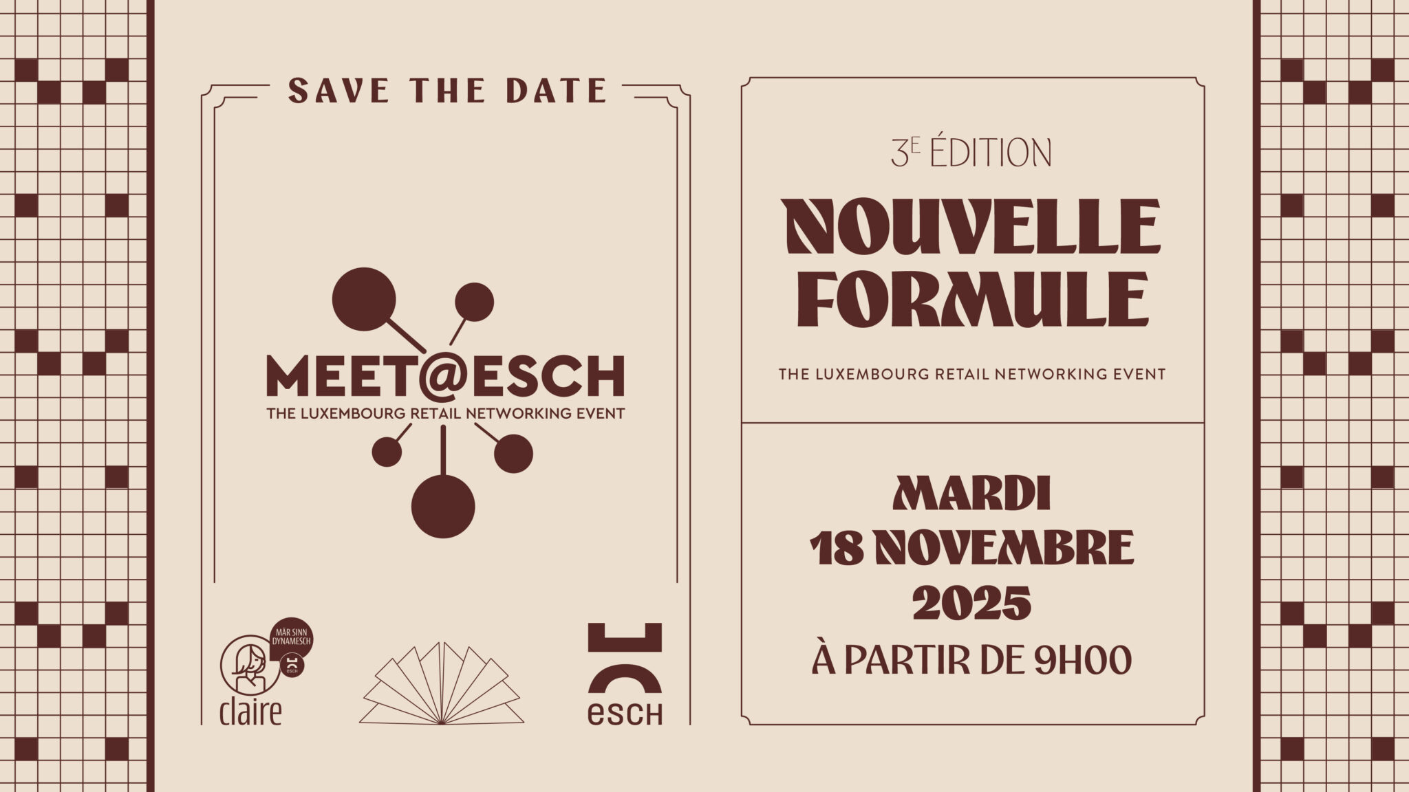 Le mardi 18 novembre 2025, la Halle des Poches à Fonte à Esch-Belval accueillera la nouvelle édition de Meet@Esch – The Luxembourg Retail Networking Event, une matinée entièrement dédiée au commerce, à l’entrepreneuriat et à l’innovation. Cet événement rassemblera les acteurs du secteur autour de conférences inspirantes, d’échanges d’expériences et de moments de networking conviviaux.