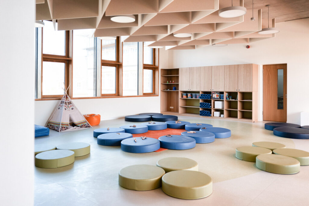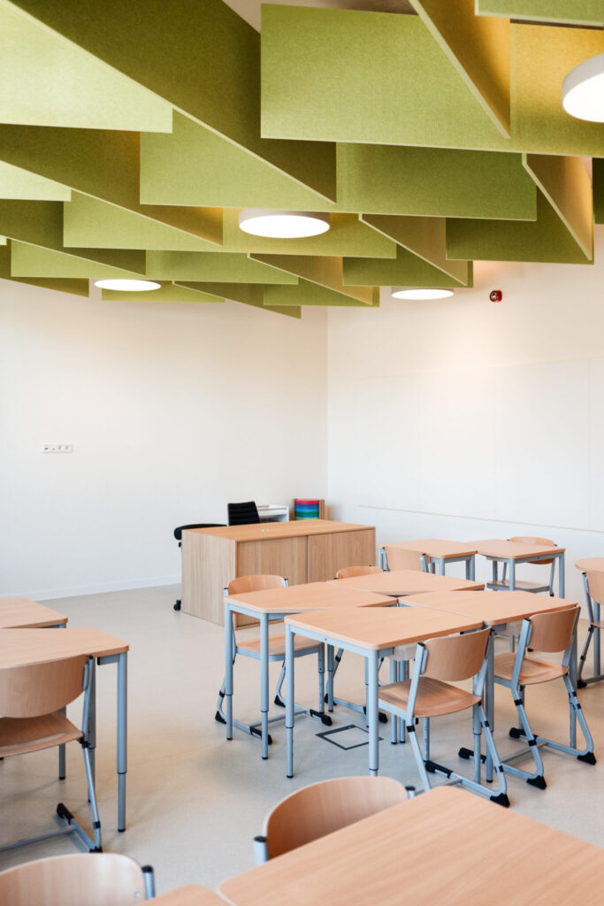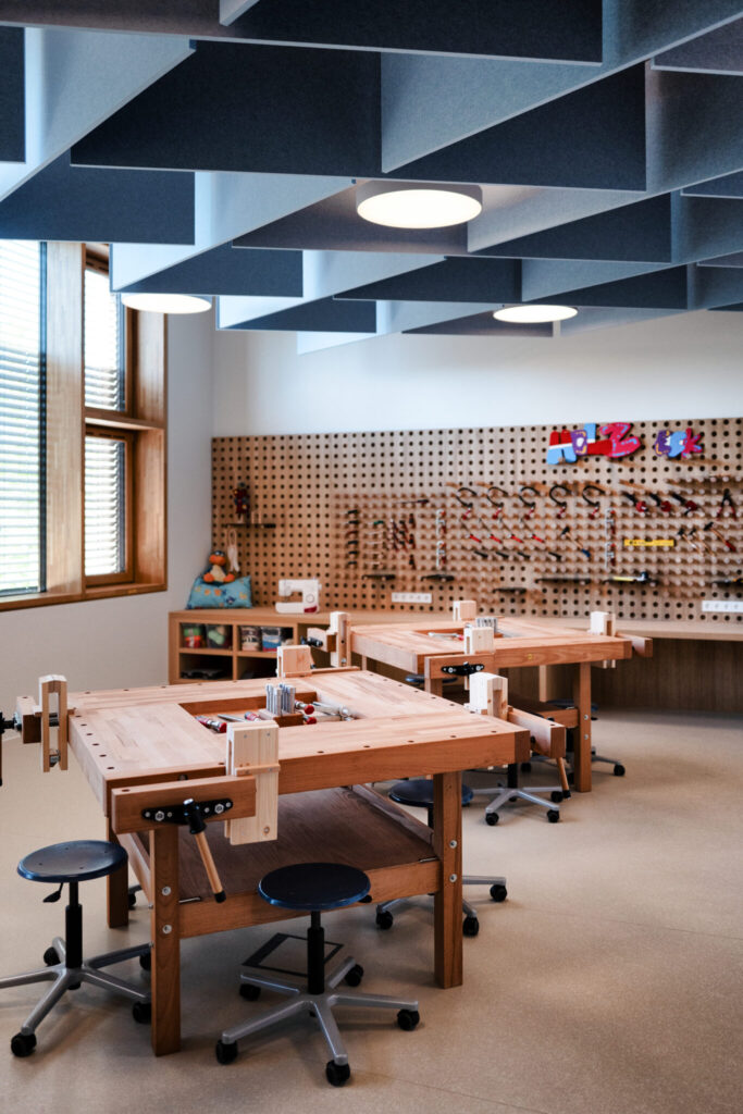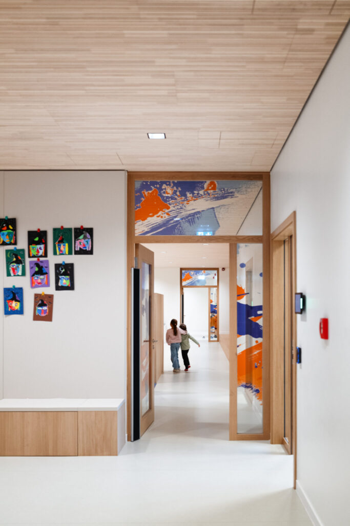 L’architecture innovante du site se distingue par des passerelles reliant les différents bâtiments et une cour de récréation centrale, créant une atmosphère conviviale et apaisée au cœur de la ville. Au-delà des briques, c’est toute l’organisation pédagogique qui a été repensée : l’école et la Maison Relais ne sont plus séparées mais fonctionnent en totale symbiose. Les espaces intérieurs sont partagés et modulables, permettant une transition fluide et harmonieuse entre les temps d’enseignement et d’accueil périscolaire pour les 360 enfants que le site pourra accueillir à terme.