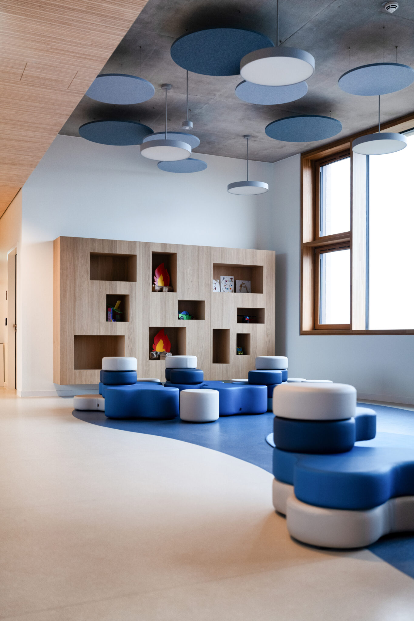 L’architecture innovante du site se distingue par des passerelles reliant les différents bâtiments et une cour de récréation centrale, créant une atmosphère conviviale et apaisée au cœur de la ville. Au-delà des briques, c’est toute l’organisation pédagogique qui a été repensée : l’école et la Maison Relais ne sont plus séparées mais fonctionnent en totale symbiose. Les espaces intérieurs sont partagés et modulables, permettant une transition fluide et harmonieuse entre les temps d’enseignement et d’accueil périscolaire pour les 360 enfants que le site pourra accueillir à terme.