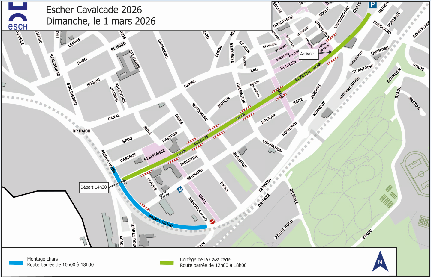 En raison de l’organisation de l’événement « Escher Fuesent », la Place de l’Hôtel de Ville sera fermée à la circulation du 28 février 2026 à 04h00 au 2 mars 2026 à 08h00.
